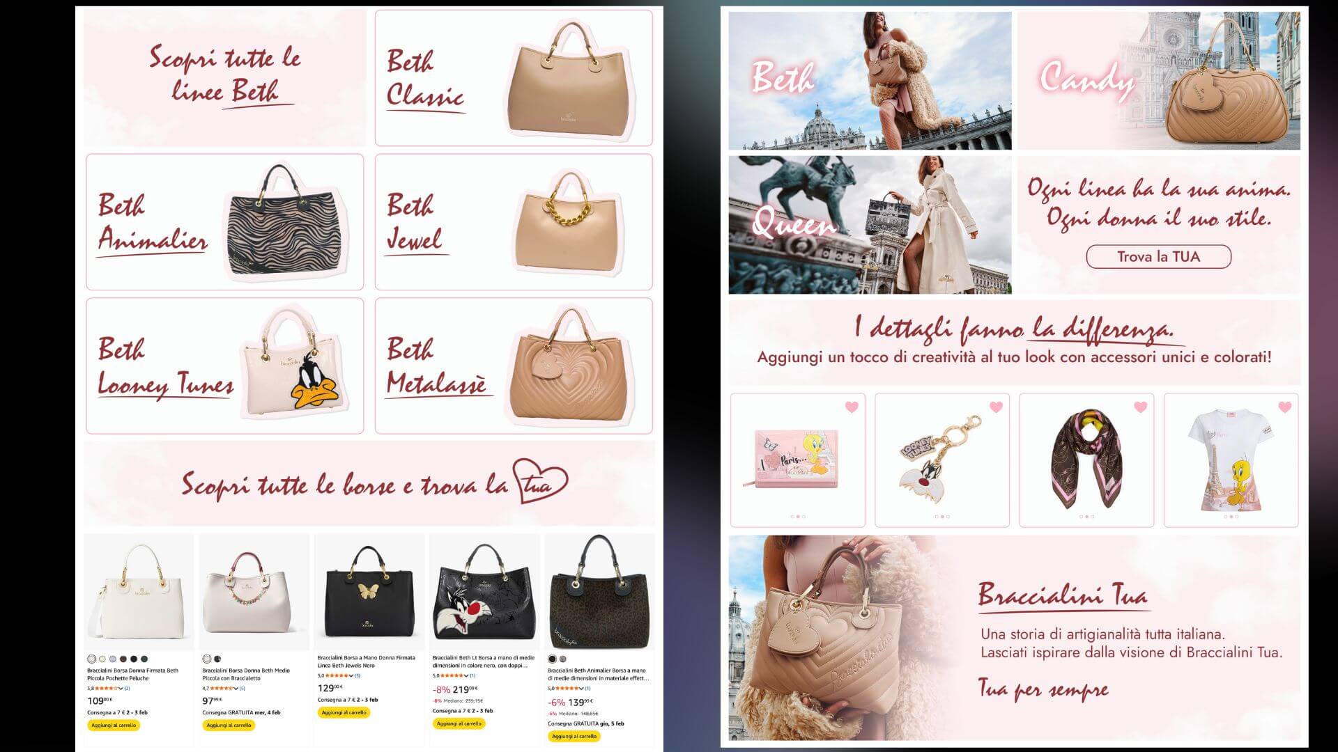 Braccialini è un brand iconico della pelletteria italiana, noto a livello internazionale per il suo stile inconfondibile e l’attenzione al design. Un brand con una forte identità visiva e un posizionamento consolidato nel settore fashion.
